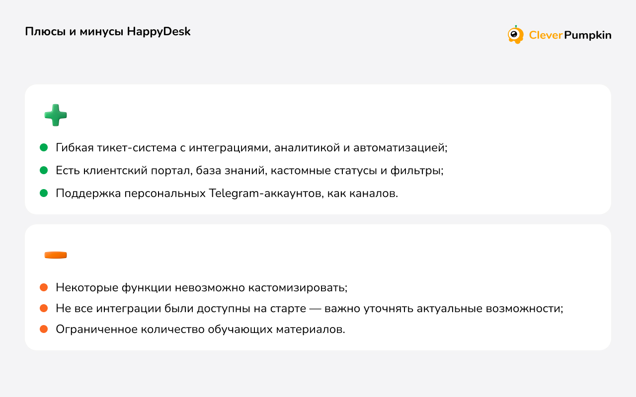 В качестве альтернативы можно рассмотреть HappyDesk. Сервис предлагает функциональность для автоматизации работы с обращениями, при этом ориентирован как на малый, так и на средний бизнес. Помогает централизованно обрабатывать запросы из разных каналов: с сайта, мессенджеров, email и соцсетей. Среди плюсов — развитая аналитика, возможность кастомизации сценариев, интеграции с CRM.