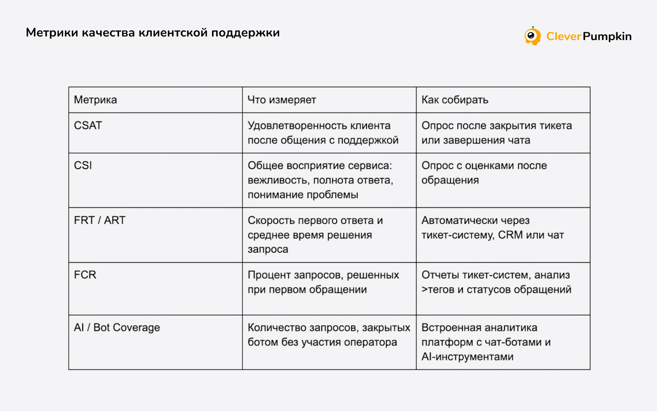 В таблице мы собрали ключевые метрики, которые помогут с оценкой качества вашей службы поддержки.