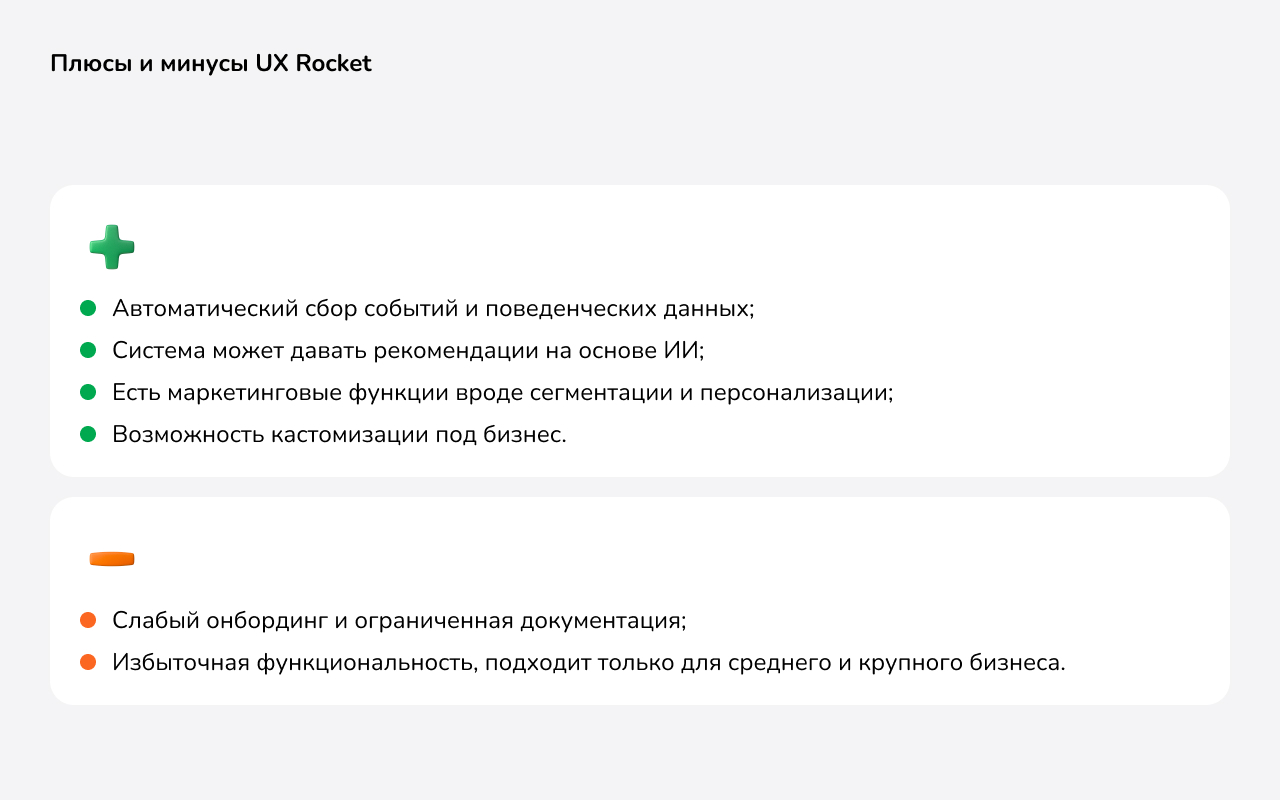Платформа UX Rocket автоматически строит воронки, выявляет падения конверсий и предлагает конкретные продуктовые гипотезы, основанные на поведенческих паттернах.