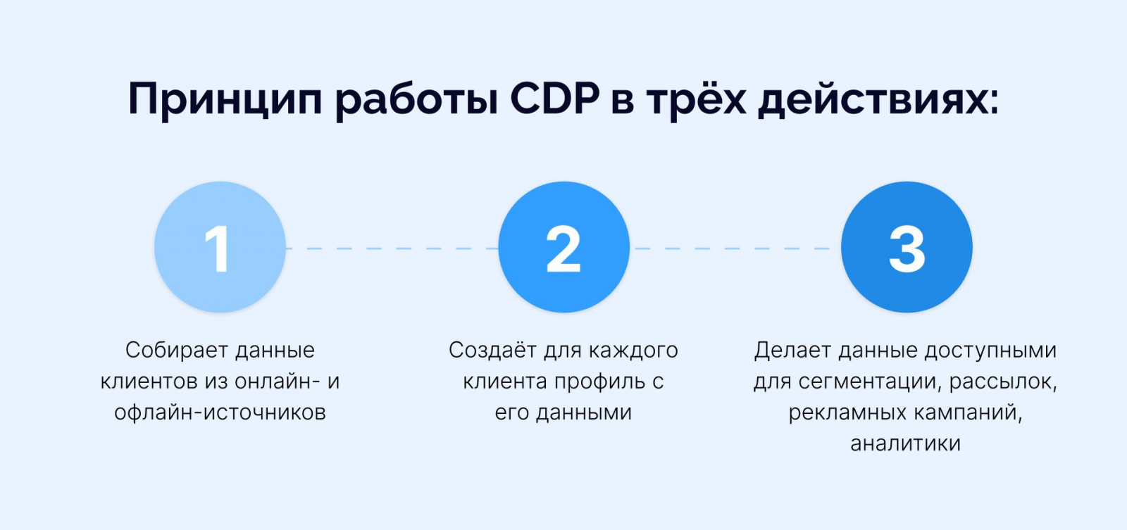 CDP (Customer Data Platform, платформа клиентских данных) — программное обеспечение, которое объединяет информацию о клиентах из разных источников в одном месте. Так у каждого клиента появляется единый профиль с его данными и историей взаимодействия с компанией. А компания может использовать эту информацию в коммуникациях — как с отдельным клиентом, так и с сегментом.