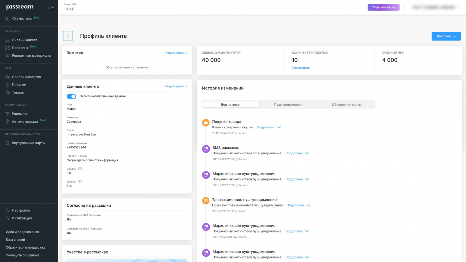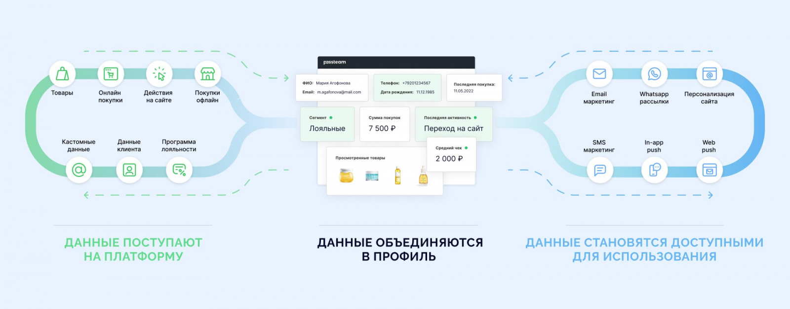 Принцип. У каждого клиента в Passteam есть профиль, в котором хранится вся информация: где открывает рассылки, как покупает, где выбирает товары. Так компания может спрогнозировать поведение клиентов и вовремя отправить им нужную рассылку. Также можно предсказать поведение клиентов на более глобальном уровне. Например, выбрать более эффективный канал связи.