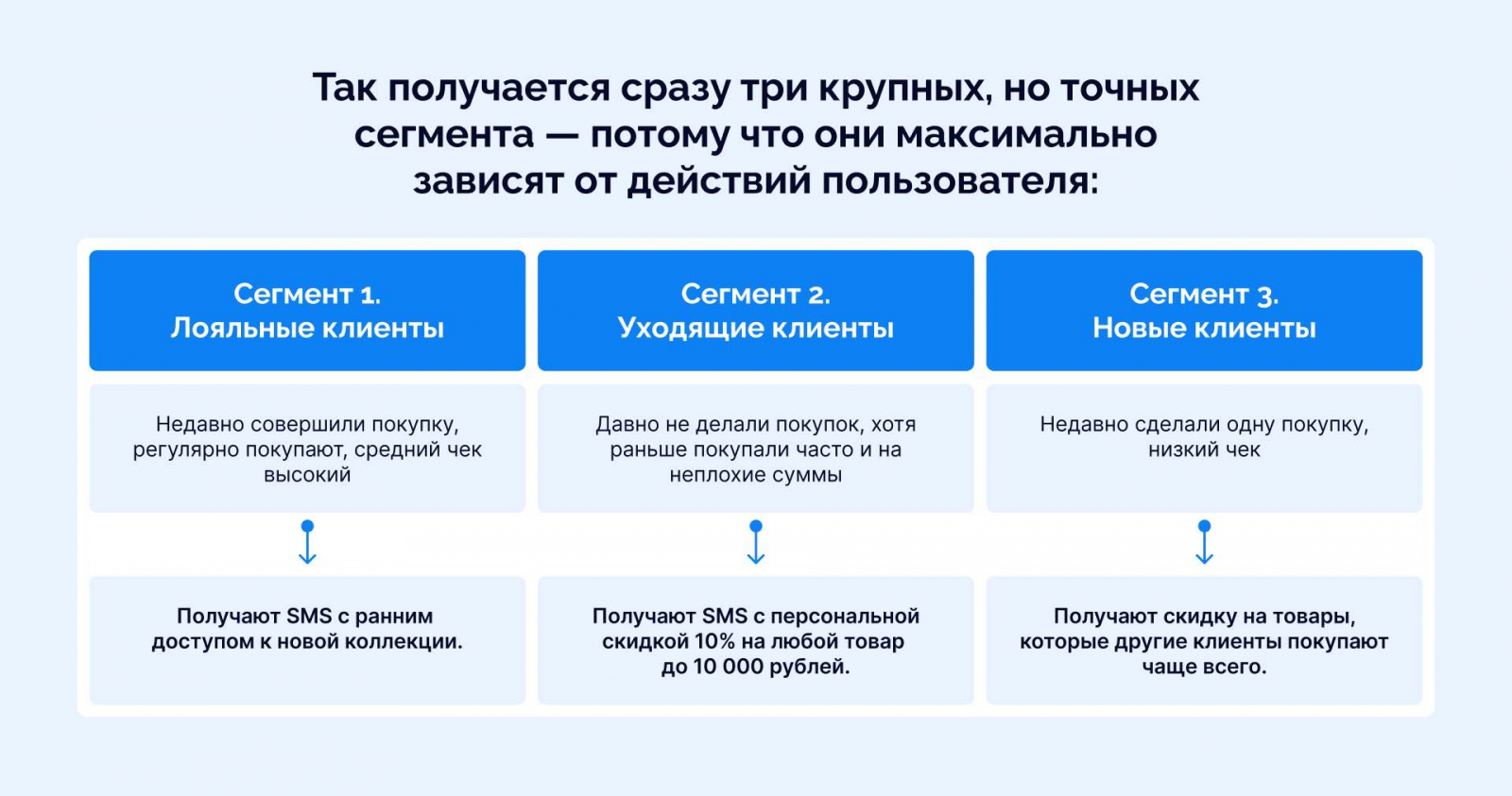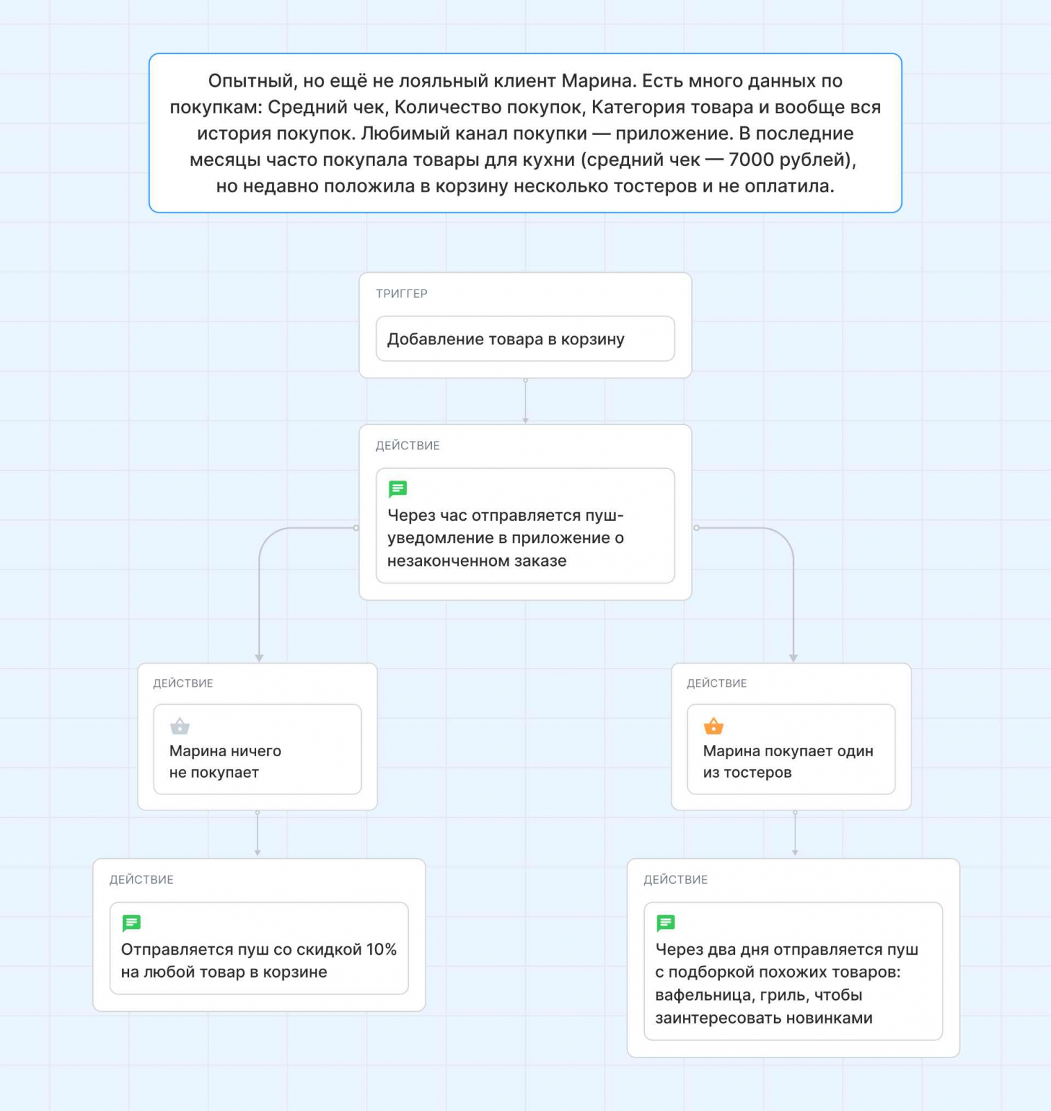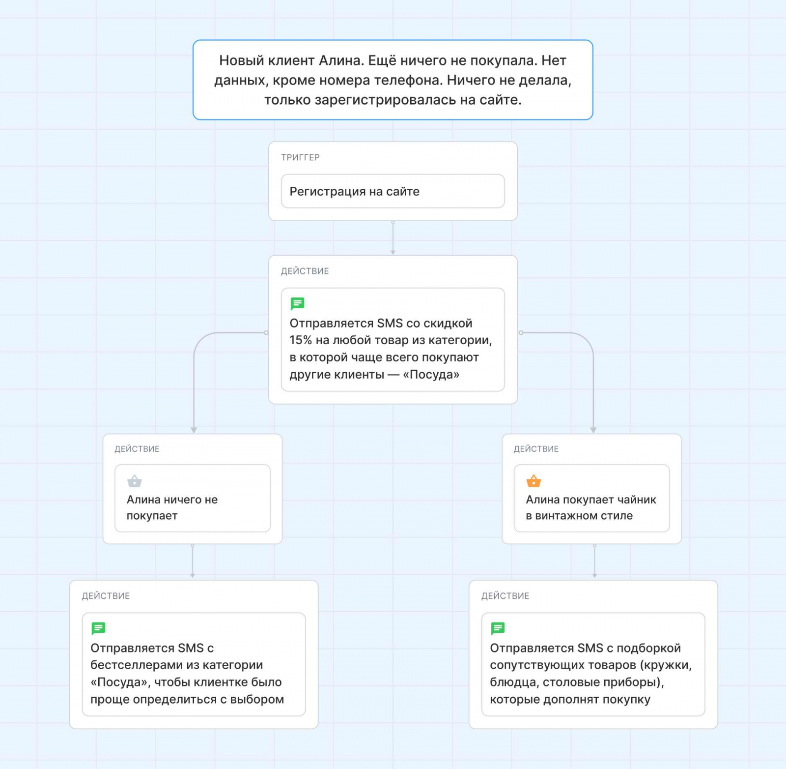 Пример. Для новой клиентки Алины у магазина пока нет данных, кроме номера телефона, поэтому он просто отправляет скидку по SMS. А вот для клиентки Марины, по которой много данных по покупкам, запускает более детальную рассылку.
