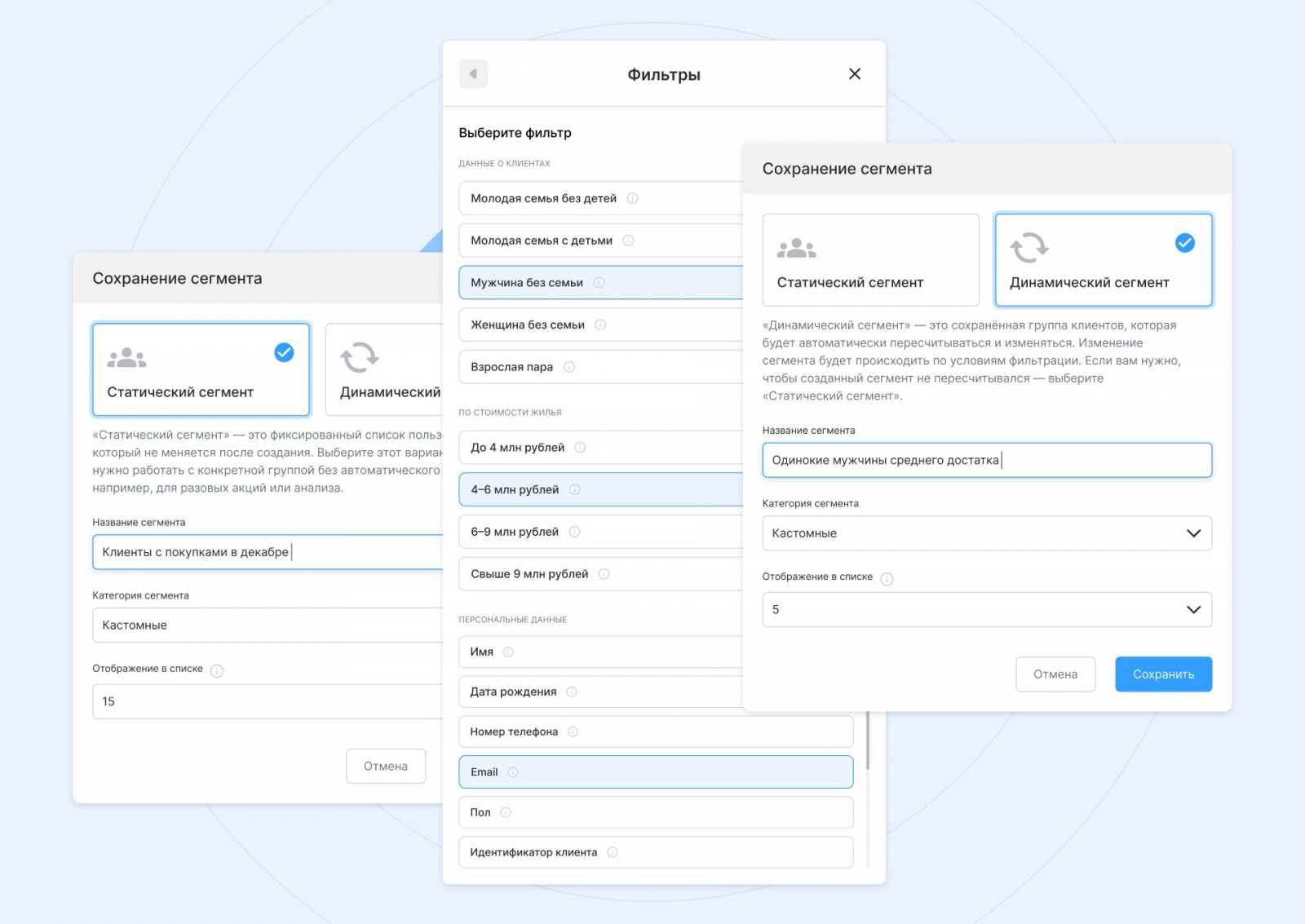 Принцип. В CDP можно не только запустить рассылку под какое-то действие пользователя — зарегистрировался на сайте, что-то купил, посмотрел товар. Если клиент долго не совершал действий и рассылки будто бы не на чем строить — можно поделить аудиторию на сегменты по демографическим данным. Например, по полу, дате рождения или городу. А когда появятся данные по покупкам, можно создавать более кастомные сегменты — например, женщины, которые покупают каждый месяц больше, чем на 1000 рублей, и любят товары из конкретной категории. В Passteam для создания сегментов есть более 50 фильтров, основанных на данных и поведении клиентов. А в сегменте может быть неограниченное количество клиентов — будь то 10, 123 или 500 000.
