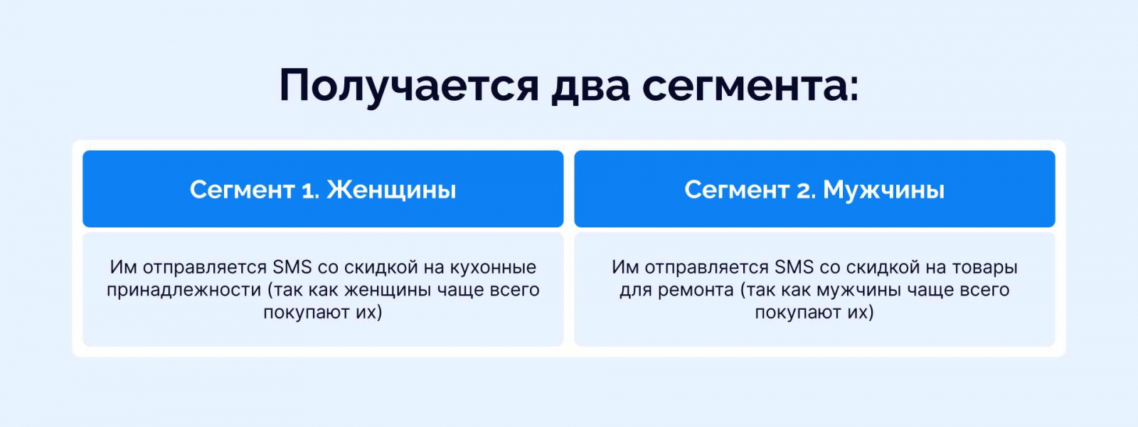 Пример. Пока магазин товаров для дома только начинает работать с платформой, он решает создать простой сегмент и фильтрует базу по полу.