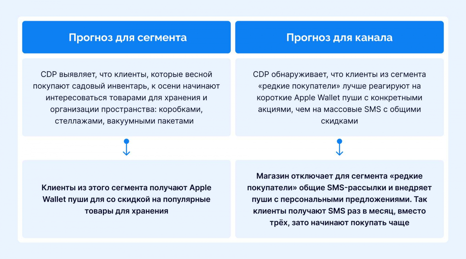 Пример. Магазин товаров для дома использует CDP, чтобы прогнозировать поведение как конкретного покупателя, так и сегмента. В итоге запускает для каждого нужную рассылку.