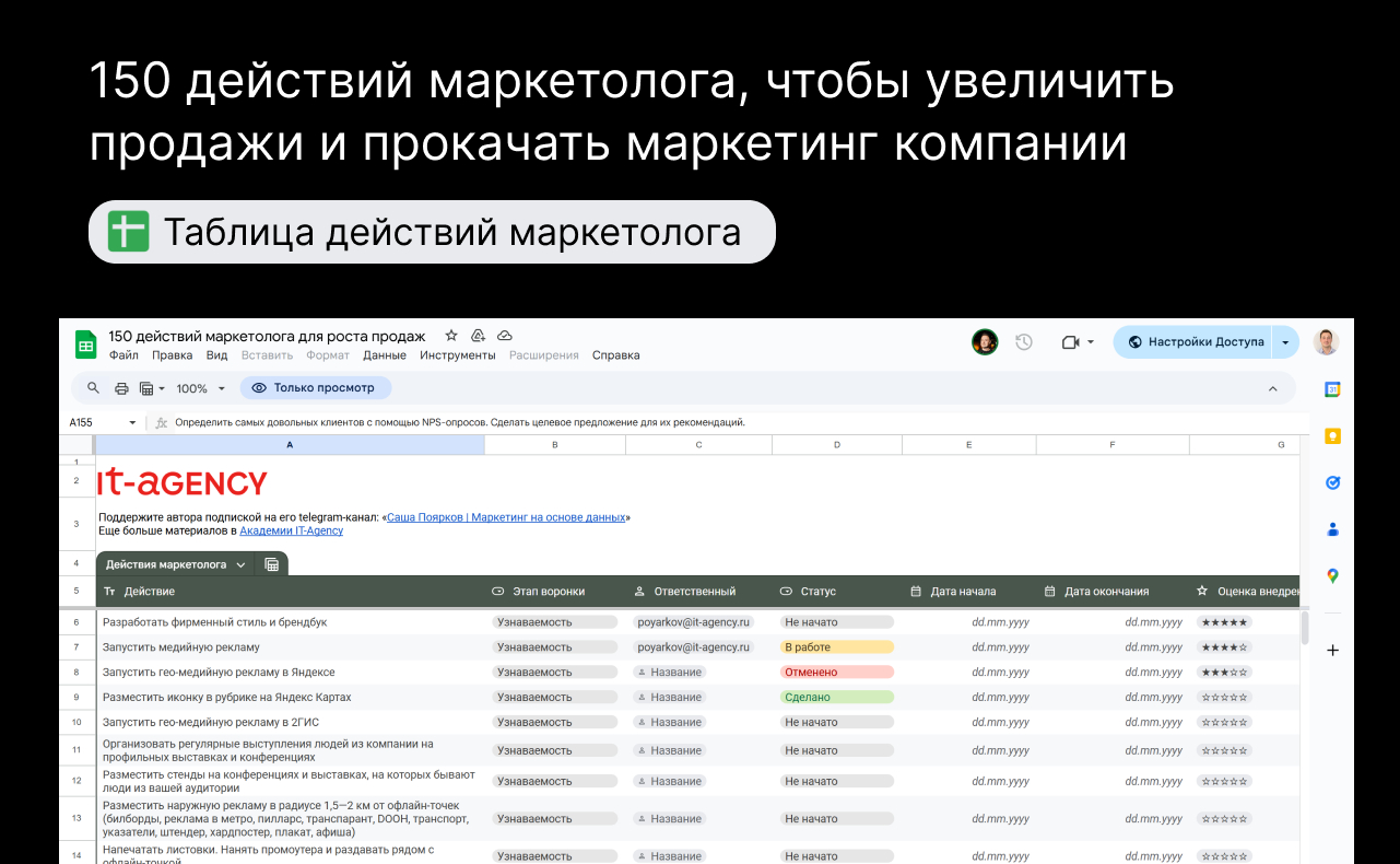 виде таблицы (сделайте копию, чтобы можно было редактировать). Забирайте себе и внедряйте. И да прибудут с вами продажи!