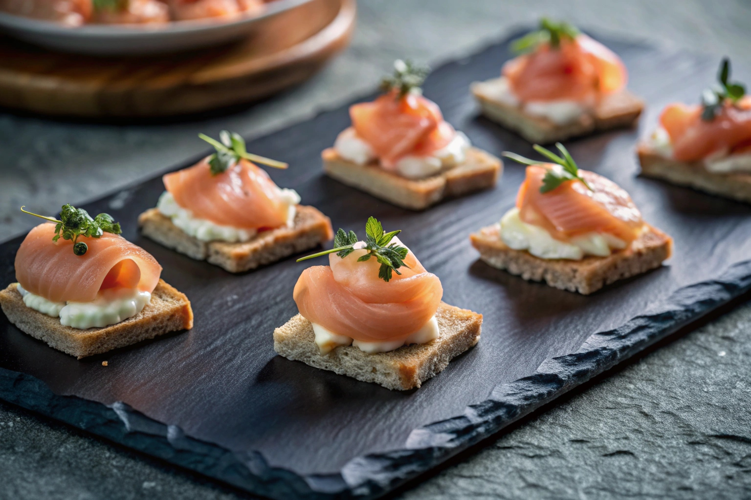 Канапе с копченым лососем, форель и другие виды красной рыбы в сочетании с авокадо, сливочным сыром и зеленью делают закуску не только вкусной, но и полезной.