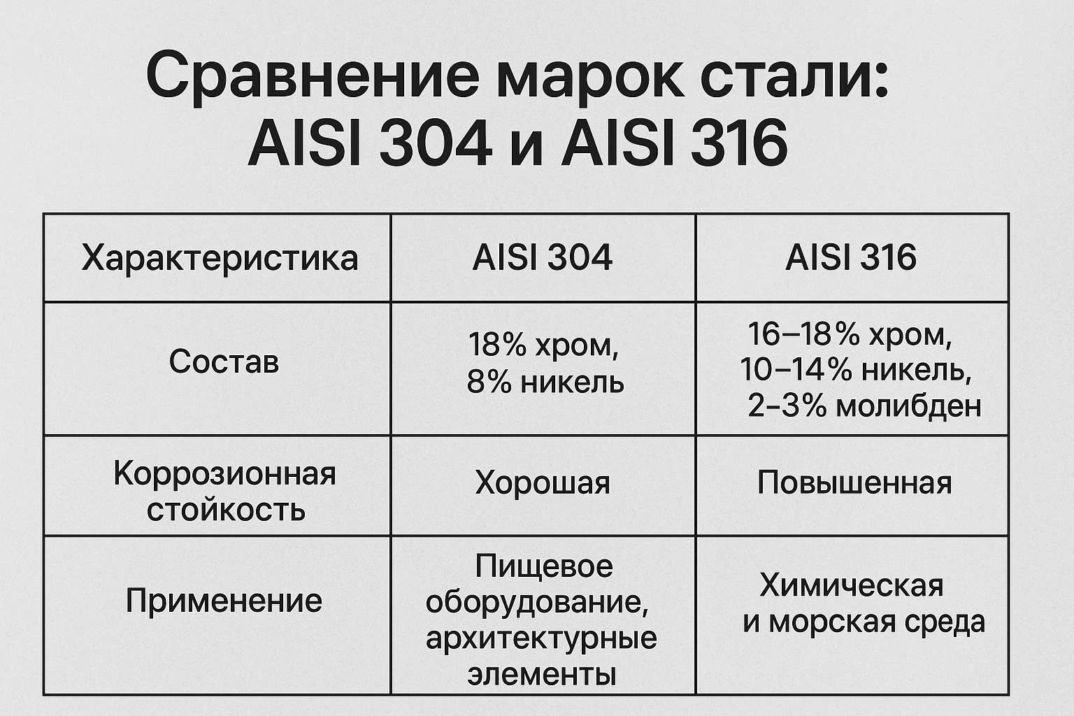 При выборе нержавеющей стали для строительных, производственных или бытовых задач часто возникает вопрос: AISI 304 или AISI 316? Обе марки относятся к аустенитным сталям и широко используются во многих отраслях. Но между ними есть важные различия, которые напрямую влияют на срок службы изделий, устойчивость к коррозии и стоимость. В этой статье — подробный разбор характеристик, отличий и сфер применения этих популярных марок стали.
