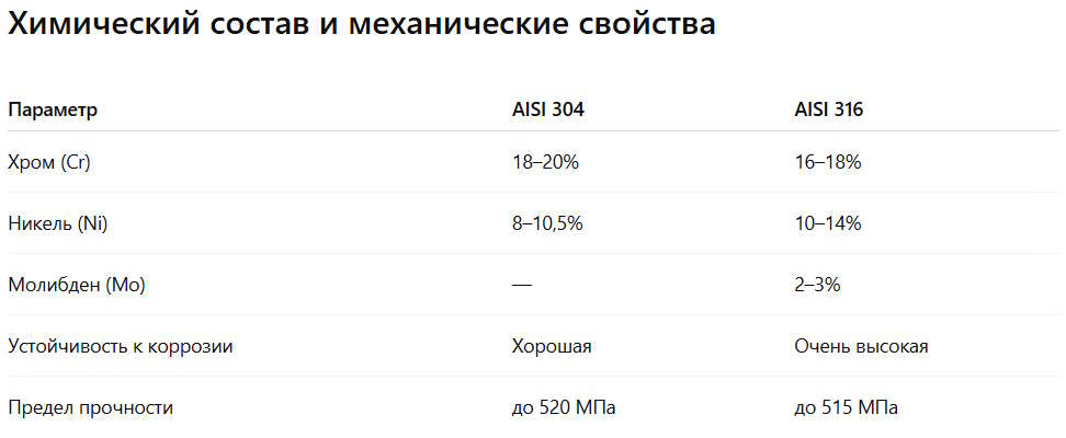 AISI 316 — улучшенная версия 304-й стали, содержащая 2–3% молибдена, который усиливает устойчивость к агрессивным средам: морской воде, кислотам и щелочам.