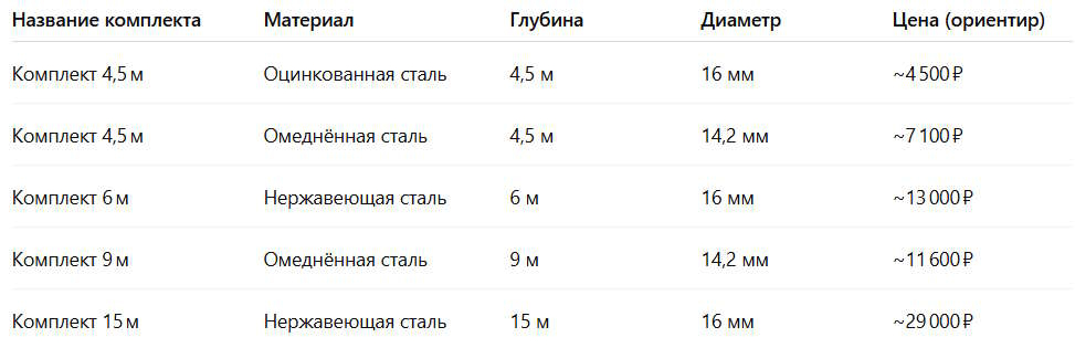 Готовый комплект — это модульная система, которая позволяет быстро собрать рабочий контур заземления. Он особенно удобен для частных лиц и небольших объектов. Обычно комплект включает: