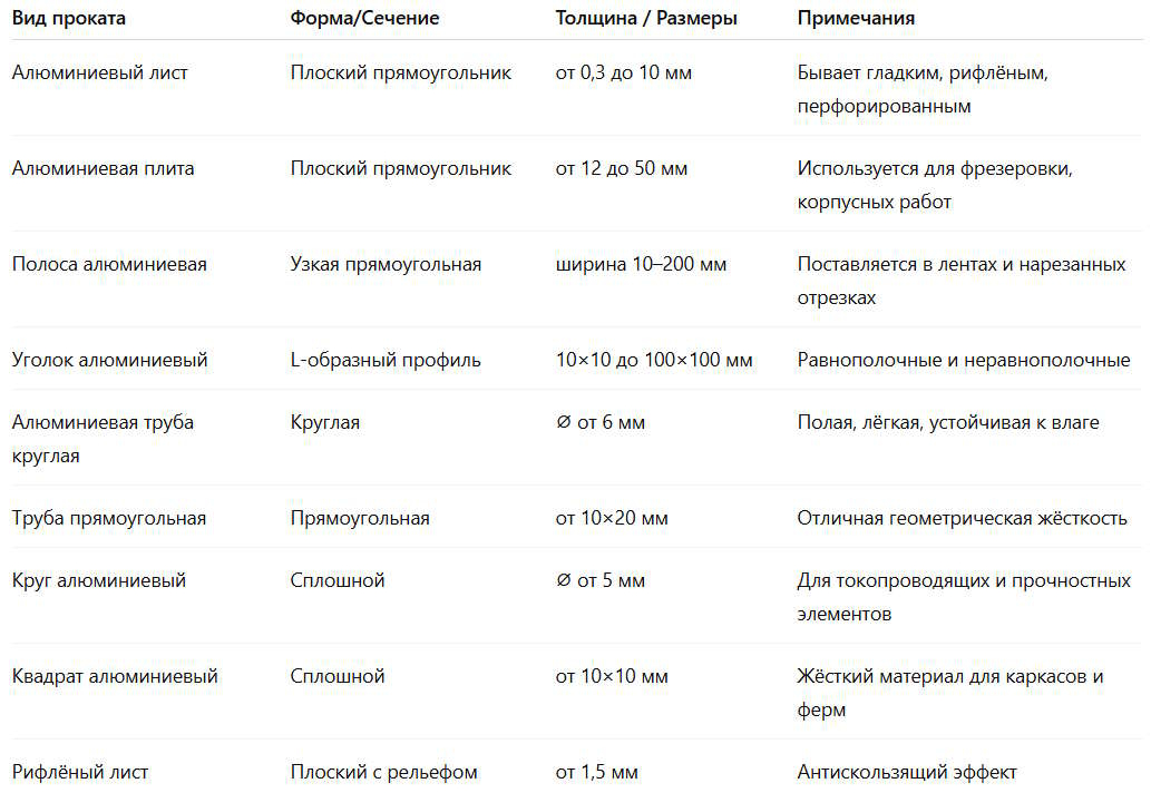 Алюминиевый прокат — это изделия из первичного или вторичного алюминия, прошедшие обработку давлением. Прокат делится по форме сечения: алюминиевые листы, алюминиевые плиты, алюминиевые трубы, алюминиевые уголки, алюминиевые полосы, алюминиевые круги и алюминиевые квадраты. Также важно учитывать способ производства (горячий или холодный прокат), вид сплава, наличие рифления или перфорации, тип покрытия (плакировка).
