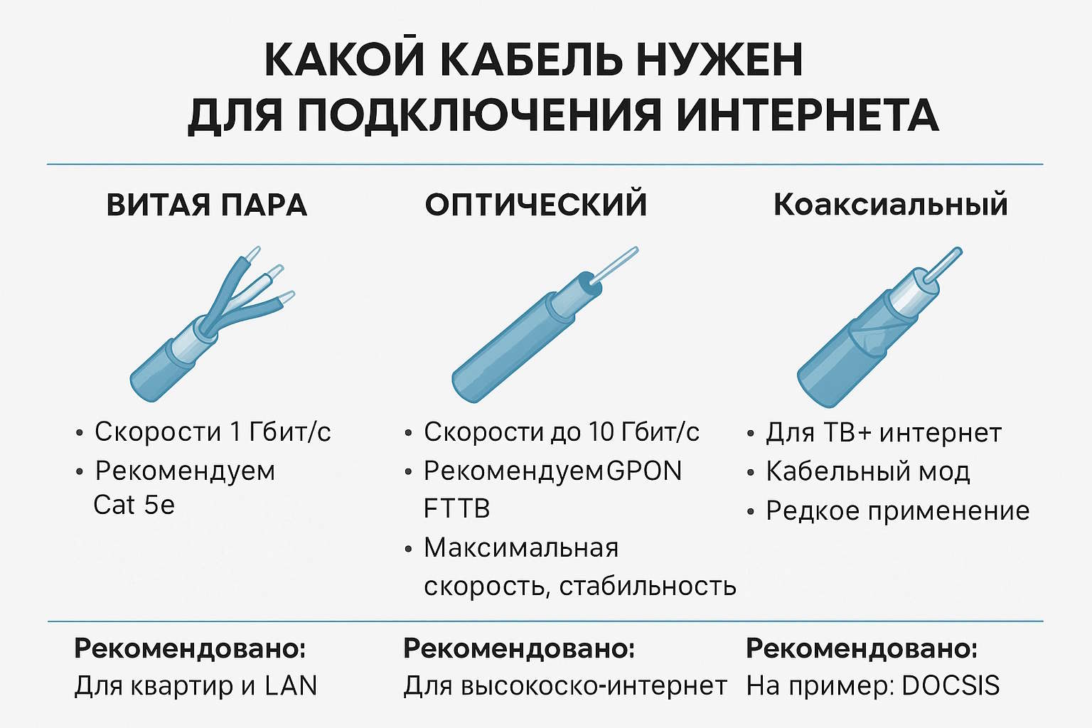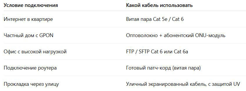Какой кабель нужен для подключения интернета от провайдера? Часто это оптоволоконный кабель, особенно если речь о GPON или Ethernet по оптике.