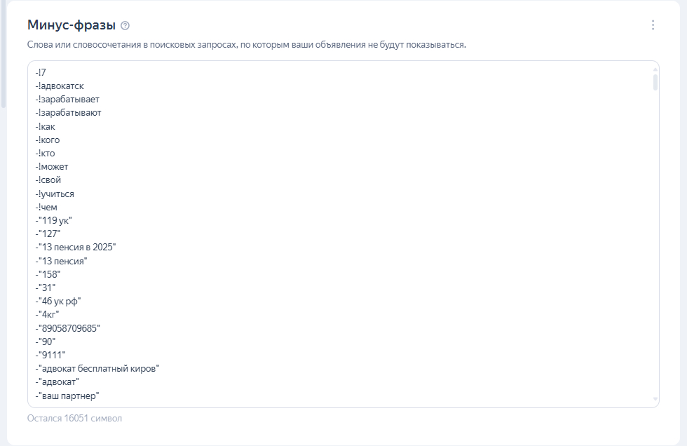 Минус-слова обязательны при автотаргетинге в Яндекс Директ.Помимо стандартного перечня минус-слов вроде «бесплатно», «вакансии», «форум», «отзывы» нужно регулярно проверять отчет "Поисковые запросы" в Яндекс Директ и расширять список. Так можно сэкономить до 20–25% бюджета.