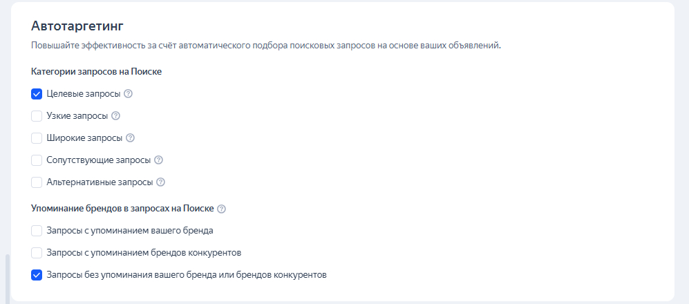 На уровне групп объявлений оставьте только категорию «Целевые запросы». Это позволит алгоритму фокусироваться именно на поисковых намерениях, связанных с вашим продуктом, а не расширять показы на околотематические категории.