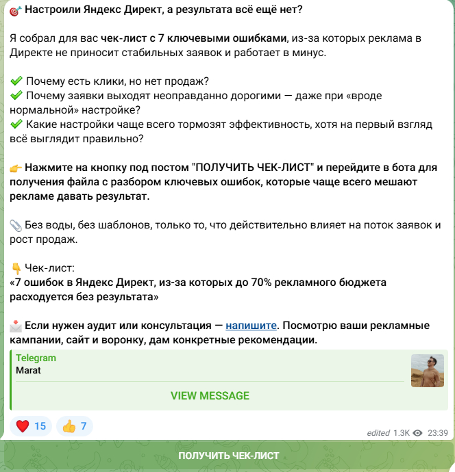 Очень часто, когда говорят «Директ не работает для Telegram», проблема не в ставках и не в кнопках. Проблема в связке от объявления до контента внутри канала.