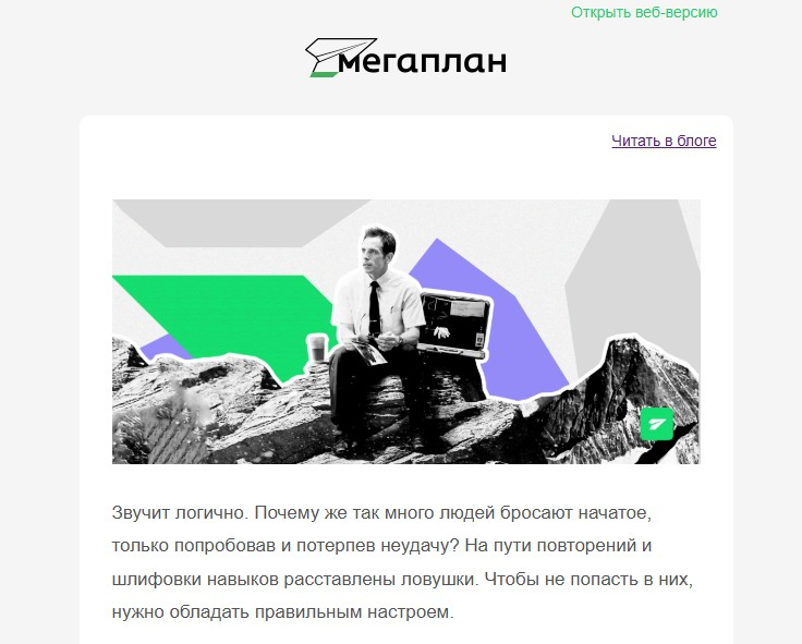 Сначала у нас было медиа на отдельном сайте, которое называлось «Большие планы». Где-то в 2015 году мы оказались на развилке: продолжать развивать своё независимое медиа, в котором изредка писали про Мегаплан, или сближать продукт и блог. В результате выбрали вторую стратегию. Блог дублирует все статьи, которые выходят в рассылке. Таким образом, они живут не 3–4 дня после отправки писем, а остаются на сайте навсегда.