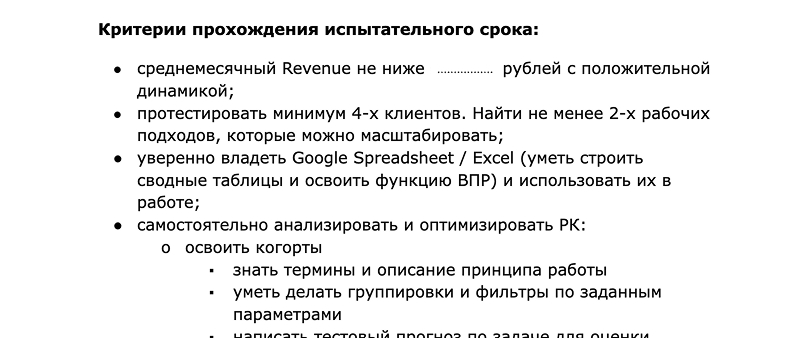Ещё на этапе оффера мы объясняем, что нужно для успешного прохождения испытательного срока. Прописываем задачи и критерии, чтобы с первого дня было понятно, на что ориентироваться и чего ожидать.
