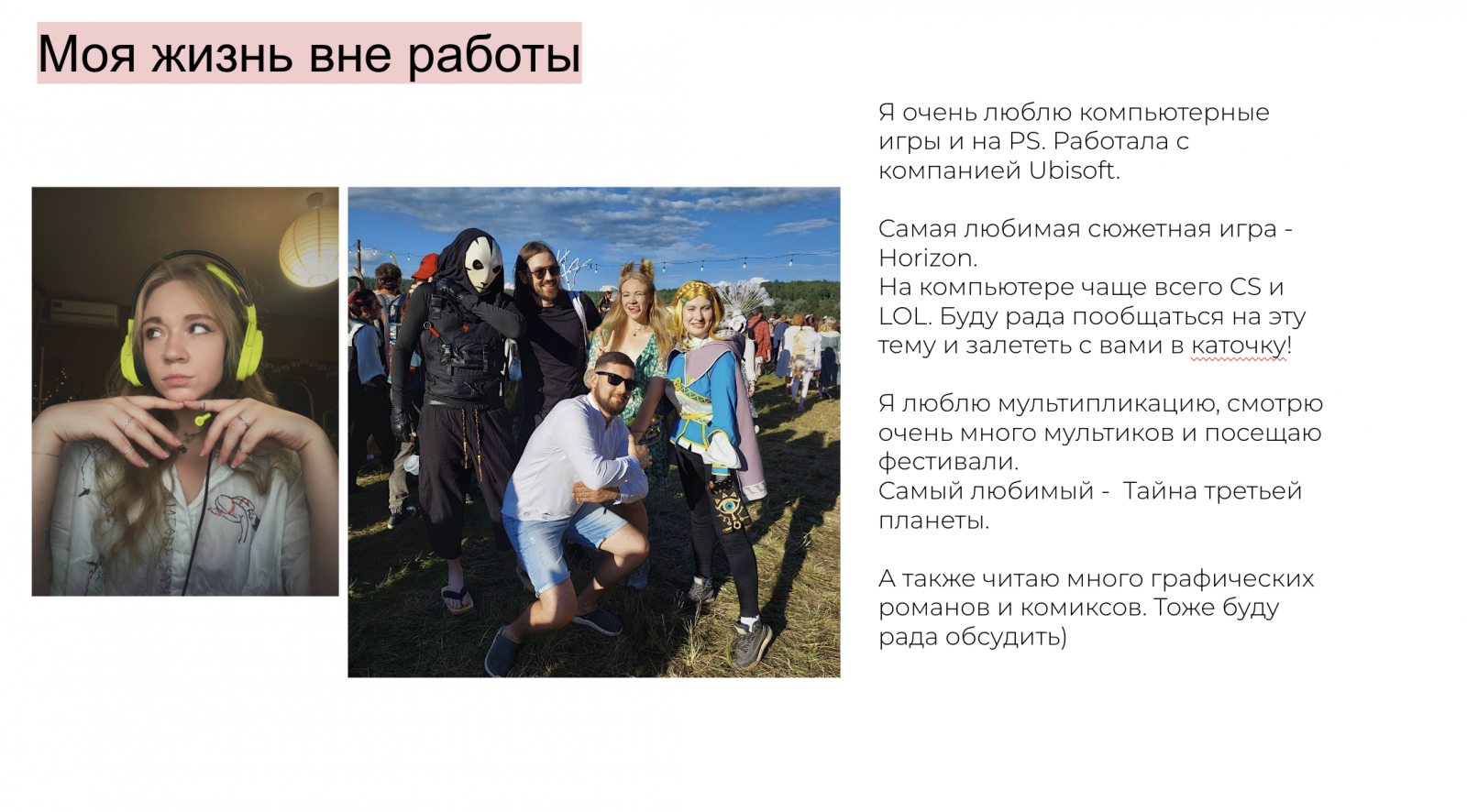 На этом оно не заканчивается. У новичка есть задание — подготовить презентацию о себе для ежемесячного командного звонка. На этом колле каждый из ребят рассказывает о себе. И это наша любимая часть! Кто-то делится, как играет в CS, кто-то рассказывает, что любит бегать или ходить в музеи. Так мы находим общие интересы и единомышленников.