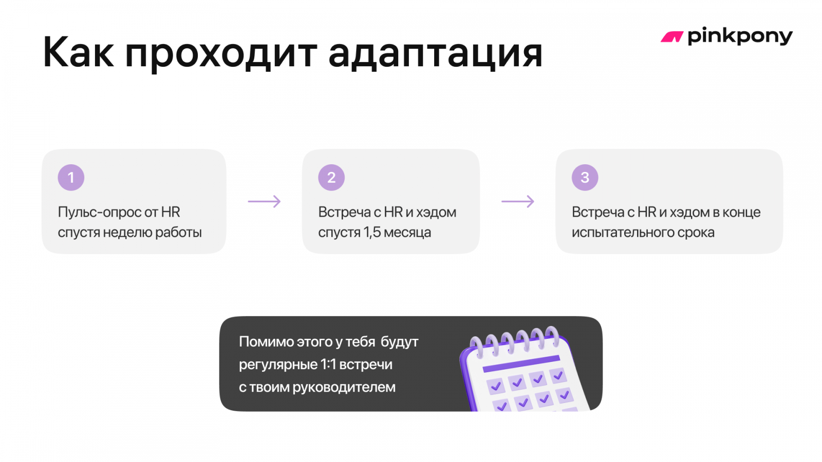 В период адаптации hr команда всегда на связи с новичком. Через неделю отправляем небольшой пульс-опрос: как дела, что нравится, что можно улучшить. В середине испытательного проводим встречу 1:1 с HR и руководителем — обмениваемся фидбэком. Мы спрашиваем, всё ли идёт по плану, и делимся своими наблюдениями. Это помогает вовремя скорректировать процесс, если что-то идёт не так. Помимо этого у коллеги проходят регулярные 1 на 1 со своим руководителем.