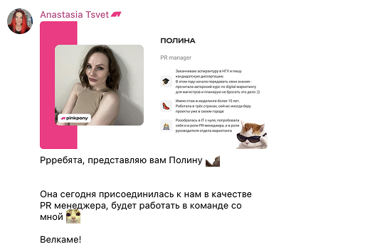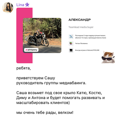 Чтобы команда больше узнала о новичке, мы просим написать три факта о себе и прислать фото. Эту визитку руководитель скидывает в общий рабочий чат в Telegram — так начинается знакомство с коллегами.