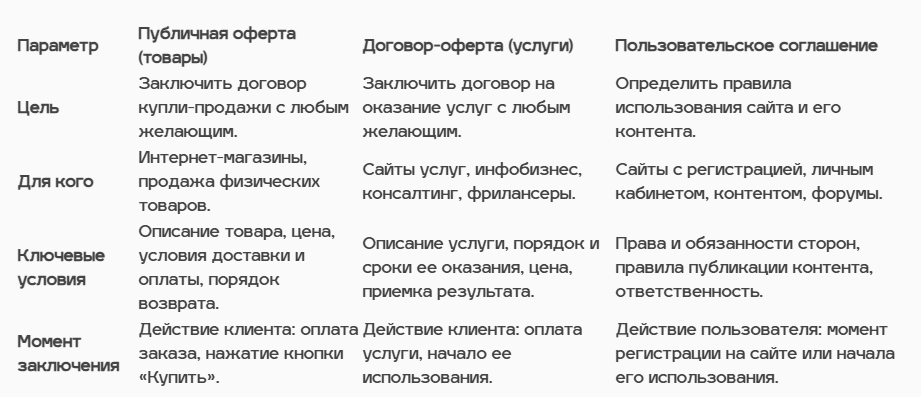 Как ясно видно из таблицы, каждый из этих документов решает свою, строго определенную задачу. Оферты, как для товаров, так и для услуг, полностью сфокусированы на процессе продажи — их цель заключить сделку и зафиксировать коммерческие договоренности. Пользовательское соглашение, в свою очередь, отвечает за порядок и правила поведения на территории вашего сайта.