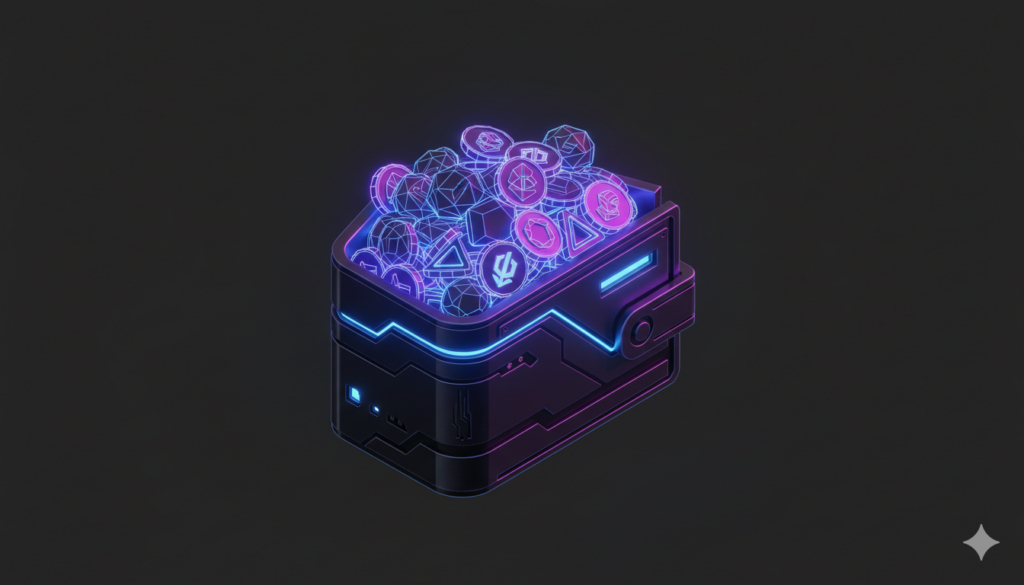 Isometric 3d icon of a digital wallet overflowing with glowing crypto coins, cyberpunk aesthetic, neon blue and purple edge lighting, dark matte background, unreal engine 5 render, octane render, clean composition, high fidelity, 4k resolution, sharp focus, no blur.