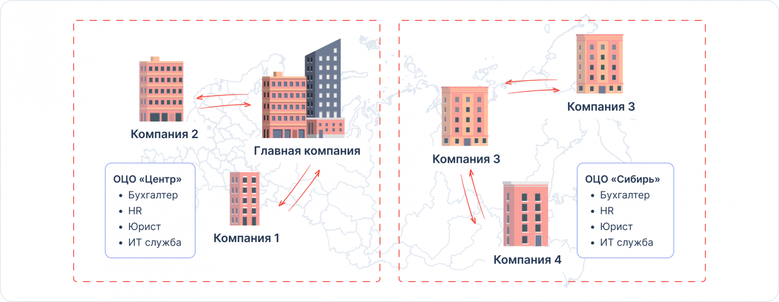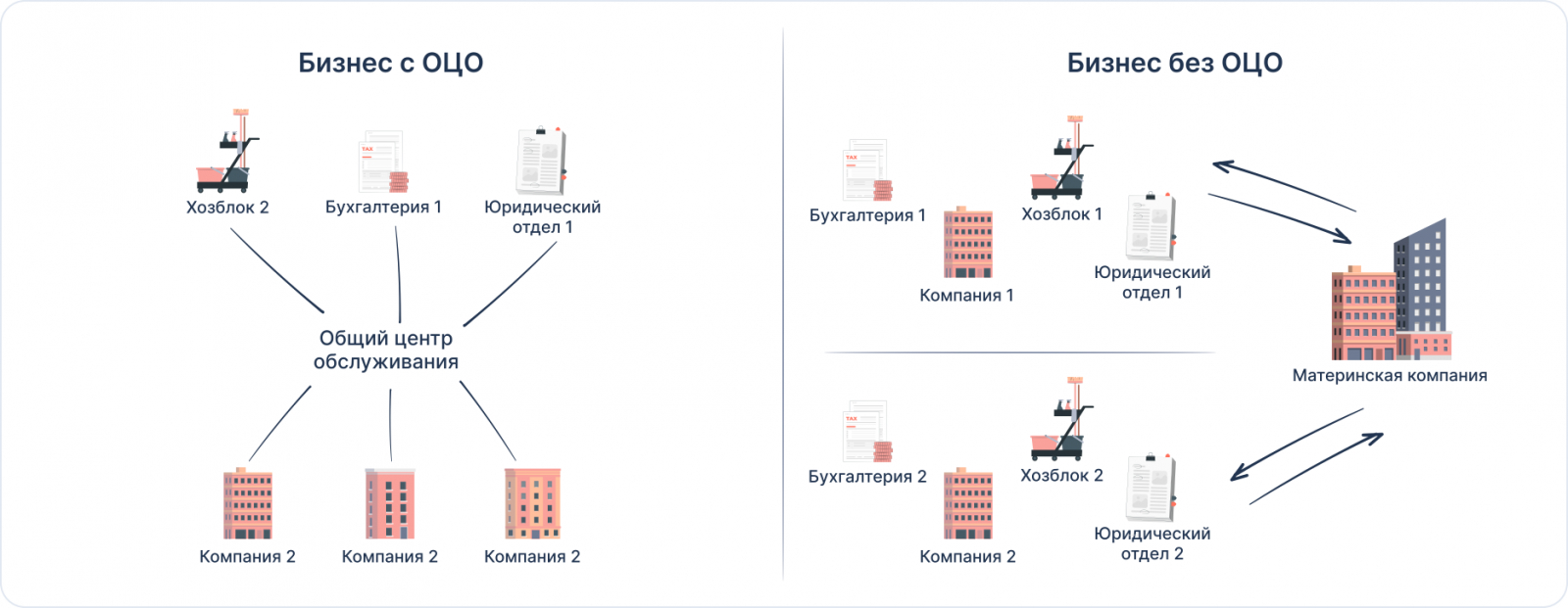 Чтобы не формировать штат под каждое юрлицо, группы компаний передают все регулярные задачи одной структуре — общему центру обслуживания, ОЦО. В этом случае рабочий процесс выстраивается так, что каждый обслуживающий отдел работает сразу с несколькими компаниями, а не только с одной.
