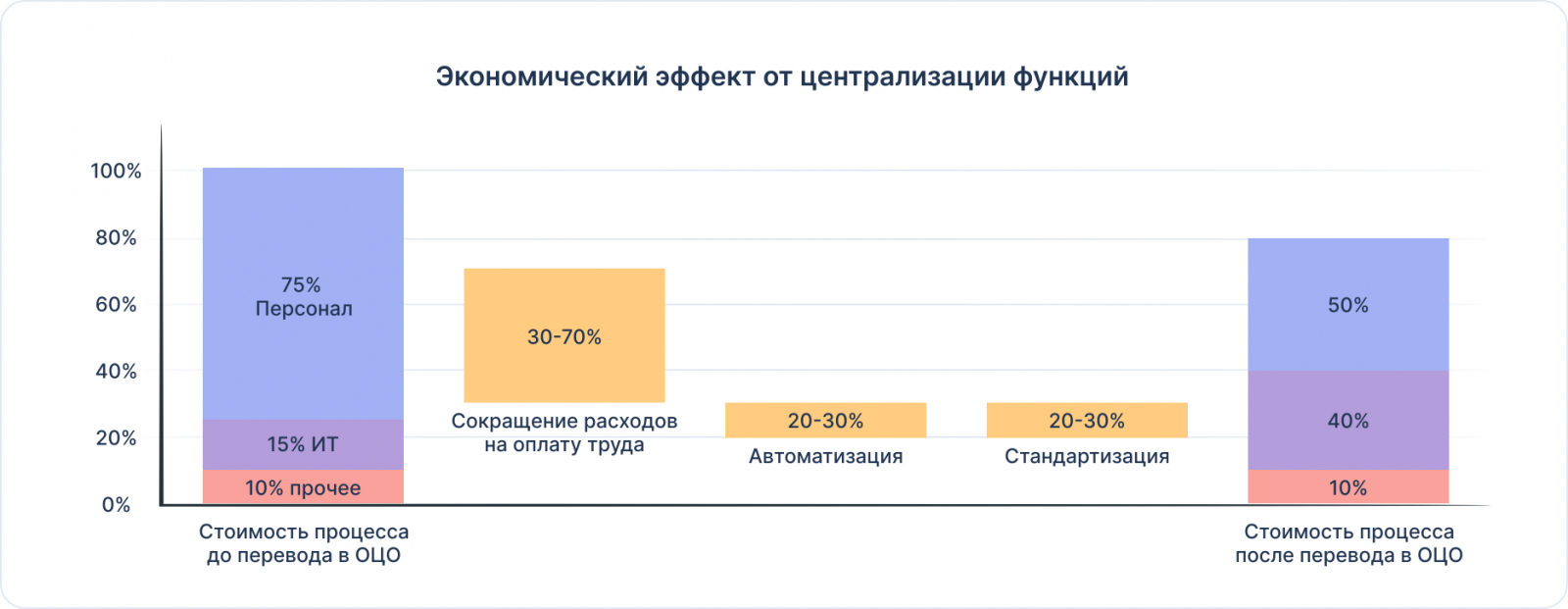 Один из главных бизнес-эффектов от внедрения общих центров обслуживания — все рабочие процессы становятся прозрачными и упорядоченными. Вместо того, чтобы координировать десятки подрядчиков и сотрудников, достаточно наблюдать за одним подотчётным ОЦО.