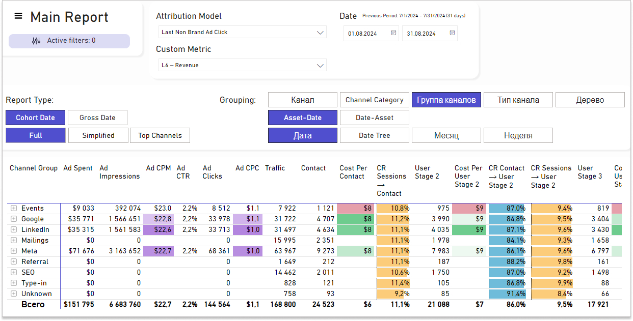 В сквозной аналитике применяется когортное отображение отчётности — пользователей разбивают на группы и отслеживают их активность. Например, если человек познакомился с продуктом на прошлой неделе, а купил на этой, система привязывает все дальнейшие шаги клиента к первому касанию.