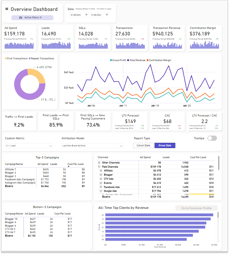 Сквозная отчётность показывает компании достоверные данные от расходов на маркетинг до доходов компании. Система собирает информацию из разных маркетинговых каналов, социальных сетей и систем веб-аналитики, например, Яндекс.Метрики и Google Analytics. Затем объединяет её с данными из CRM и других CPD, ERP-платформ и представляет эту информацию в виде подробных отчётов. Они дают чёткое понимание того, как рекламные каналы и кампании влияют на реальные бизнес-результаты, а не просто считают потенциальных клиентов.