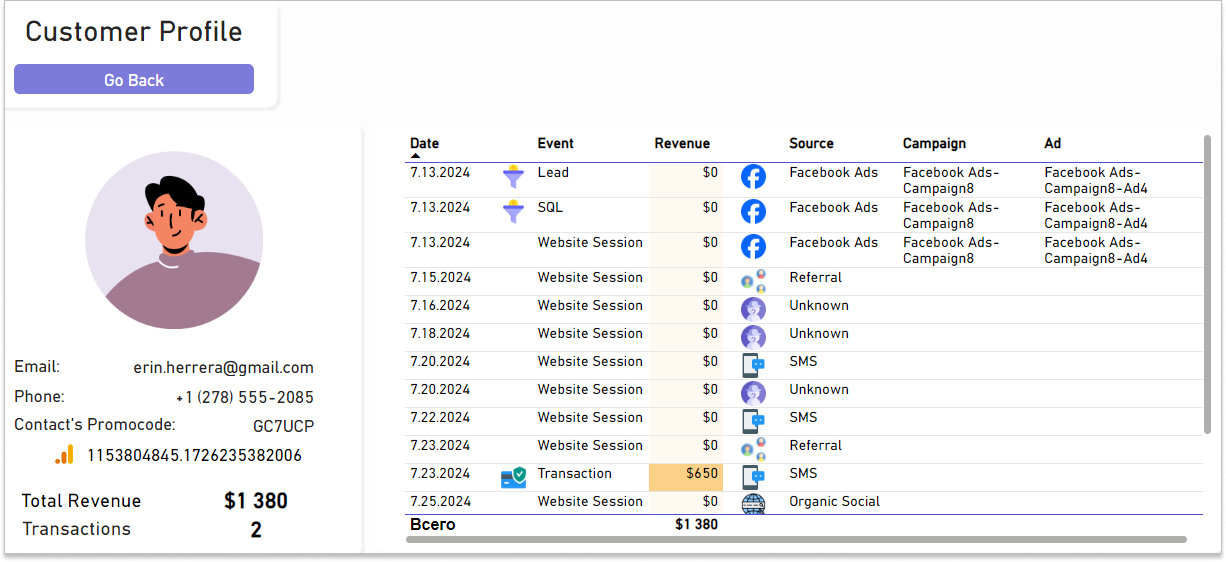 Ещё в отчётах сквозной аналитики есть хронология касания клиента с продуктом — она позволяет посмотреть всю историю клиента: переходы по рекламным объявлениям, действия на сайте, заказы и покупки. Например, можно зайти в профиль человека и посмотреть, с какой РК он пришёл, что делал и сколько денег принёс. Система определяет пользователя по ID, поэтому видно, когда действия на сайте совершает один и тот же человек.