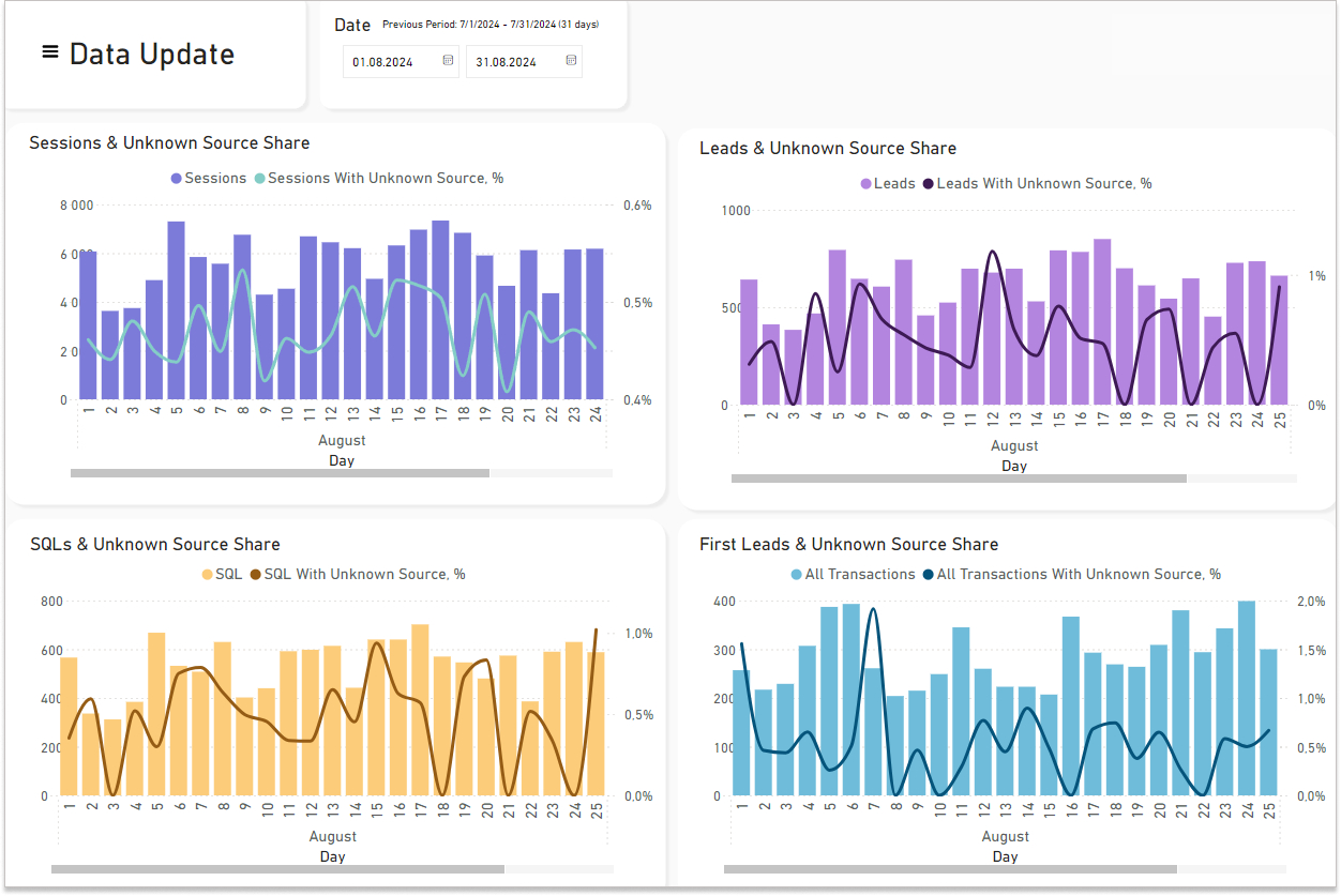 Команда, которая следит за отчётностью сквозной аналитики, ежедневно проверяет информацию на достоверность. Это позволяет вовремя находить расхождения в источниках данных и базе системы, найти причину и устранить проблему. Например, если кто-то из подрядчиков клиента запустил рекламу с неверной utm-меткой, в отчётах могут появиться не привязанные лиды. Специалистам важно вовремя это заметить.