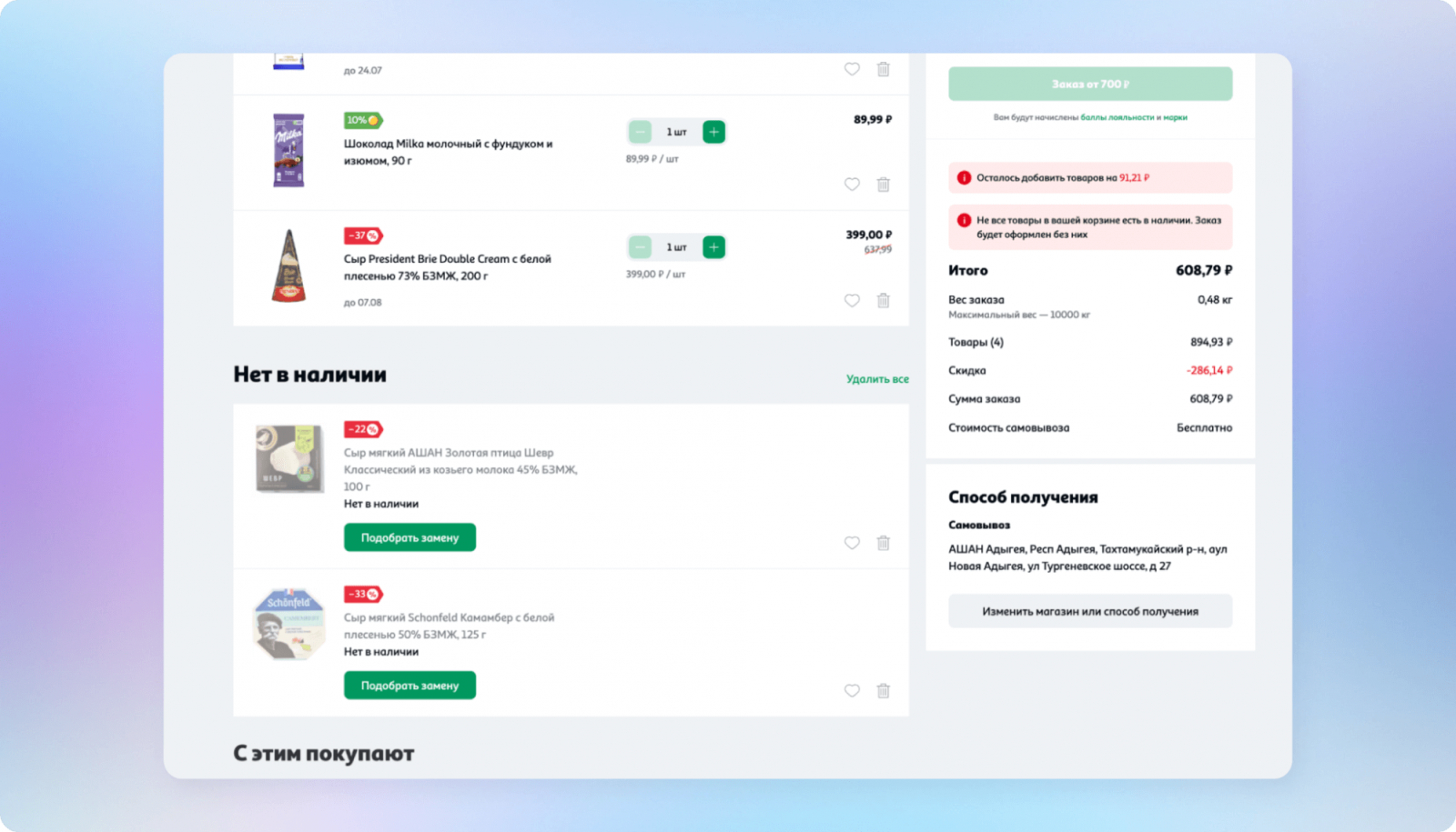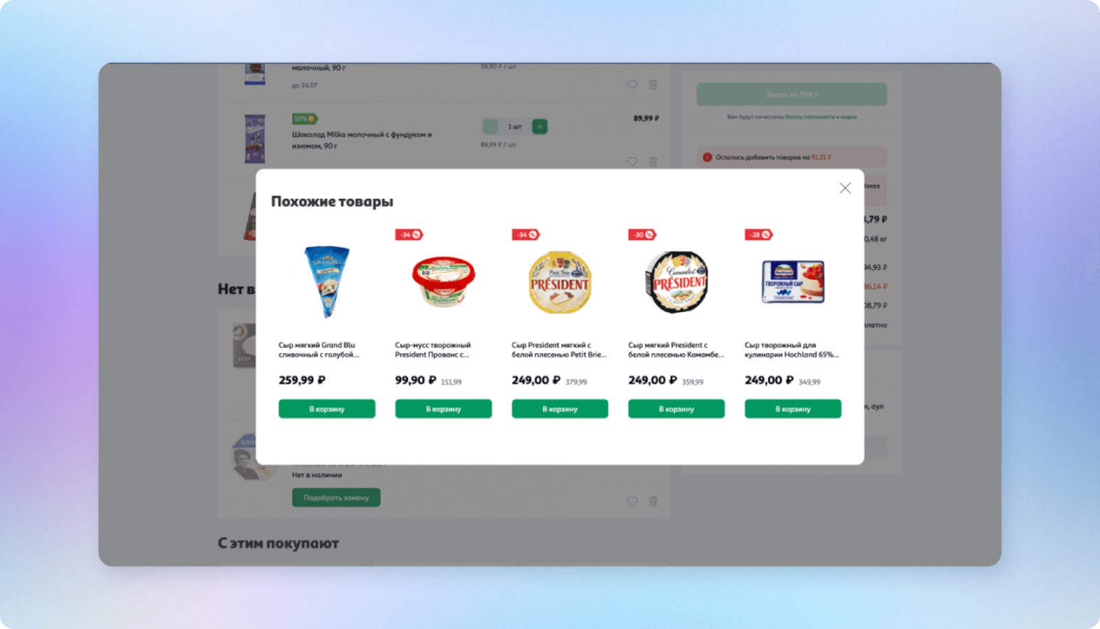 Чтобы сделать поиск аналогов более интуитивным, добавили в корзину кнопку «Найти замену» и сделали на ней большой акцент. При нажатии этой кнопки со стороны АШАН в Retail Rocket Group передаётся ID товара «не в наличии». На основе полученных данных платформа подбирает похожие товары, которые отображаются у пользователя в отдельном виджете. При этом подбирается не одна позиция, а целая серия, чтобы увеличить вероятность покупки.