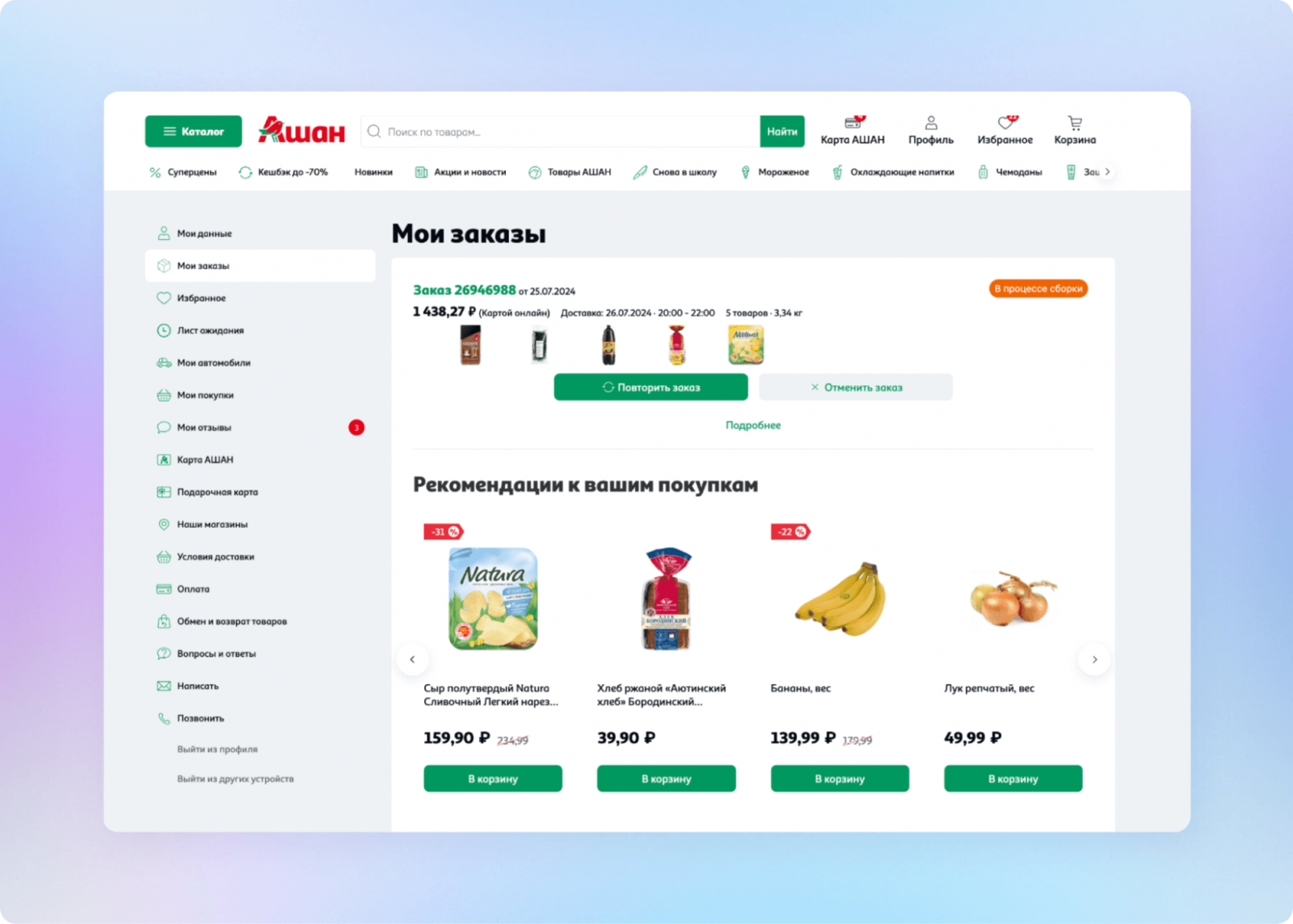Личный кабинет пользователя входит в топ-6 по количеству ежедневных посещений и глубине просмотра среди всех страниц интернет-магазина АШАН. Но несмотря на большой трафик, он не достаточно эффективно конвертировался в покупки. Чтобы исправить ситуацию, решили добавить персональные рекомендации.