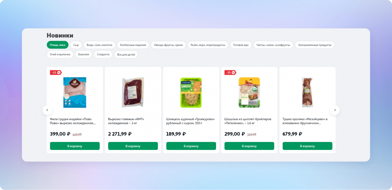 На главной странице сайта появилась товарная полка с новинками из 10 самых популярных категорий. При этом пользователь может фильтровать новинки по категории, которая его интересует. Например, молоко, мясо птицы, сладости и так далее.