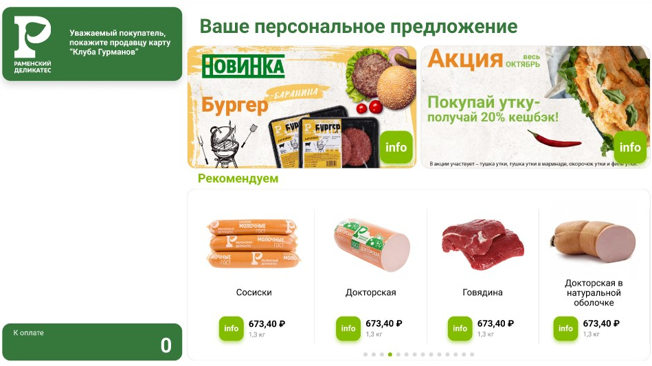 Чтобы решить эту проблему и автоматизировать процесс допродажи, «Раменский деликатес» в качестве эксперимента установил 5 прикассовых мониторов, на которых отображались чек и рекомендации.