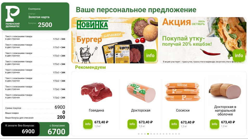 1. Если покупатель авторизовался по карте лояльности, и мы знаем его историю и предпочтения – показываем товары, которые он ранее покупал. Этот алгоритм сделали с учетом особенностей поведения покупателей «Раменского деликатеса», большинство которых, как правило, покупает одни и те же товары.