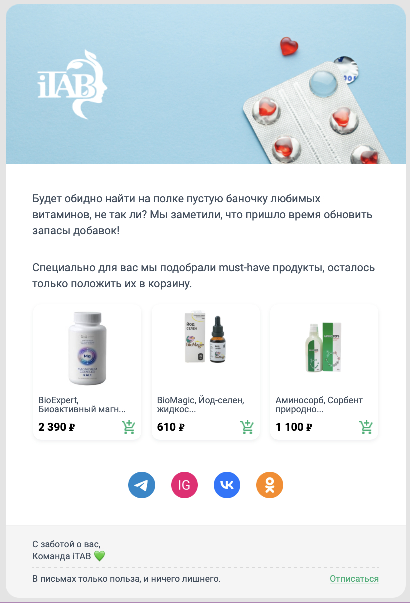 Вторая задача – сделать коммуникации персонализированными. Хотелось, чтобы при заходе на сайт каждый клиент чувствовал, что мы заботимся о нем, буквально читаем мысли и рекомендуем то, что нужно. Нам важно было закрывать потребности посетителей всеми возможными способами: предлагать подходящие добавки, напоминать обновить домашнюю аптечку и быть для человека «спасательным кругом», если подкачало здоровье.