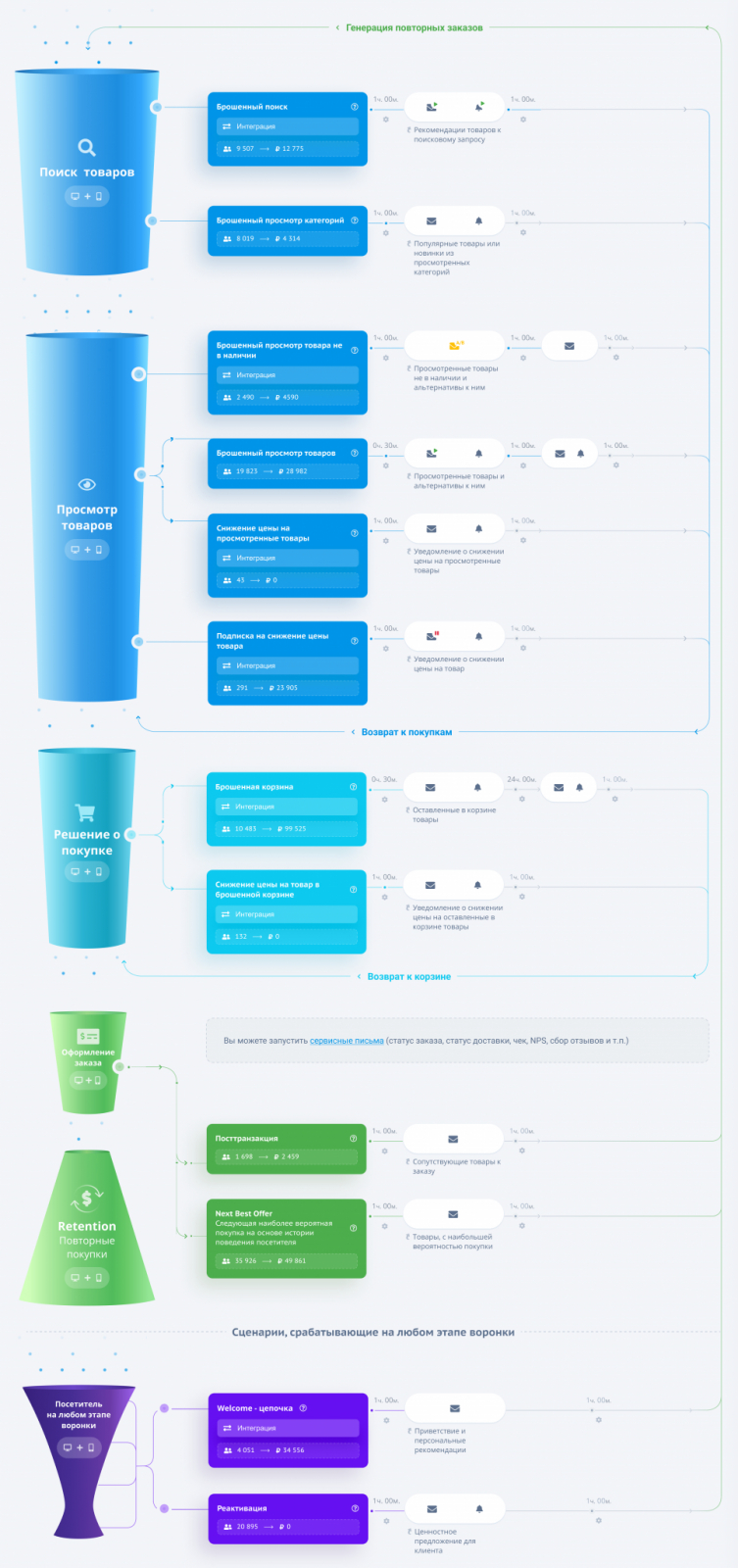 Удобно, что карта уже была преднастроена. Не пришлось ничего придумывать и тратить деньги и время на разработку – систему адаптировали под наши задачи за пару дней. Еще понравилось, что сценарии не конфликтуют между собой, покрывают все этапы Customer Journey Map и учитывают поведение на сайте и персональные интересы каждого клиента.
