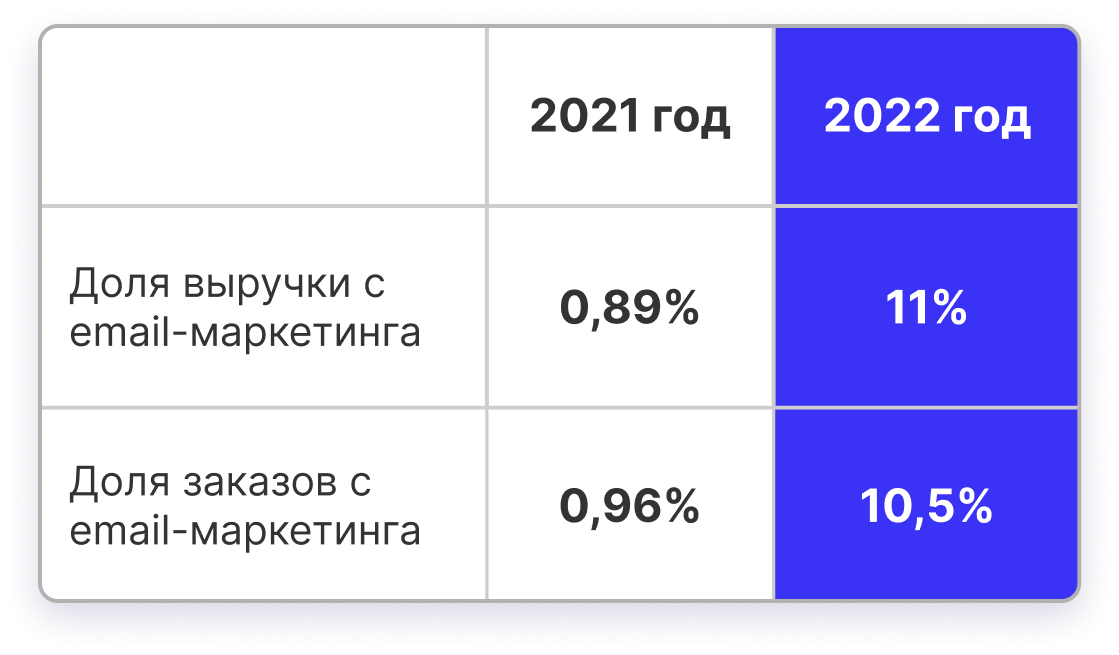 Выручка с триггерных рассылок за год выросла на 90%, и в целом email-канал стал генерировать больше заказов и выручки.