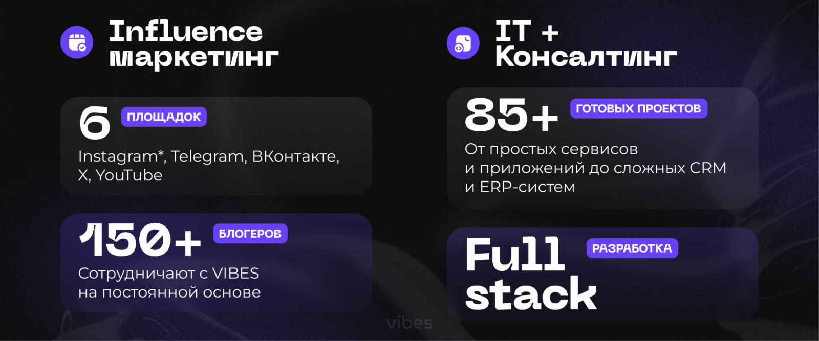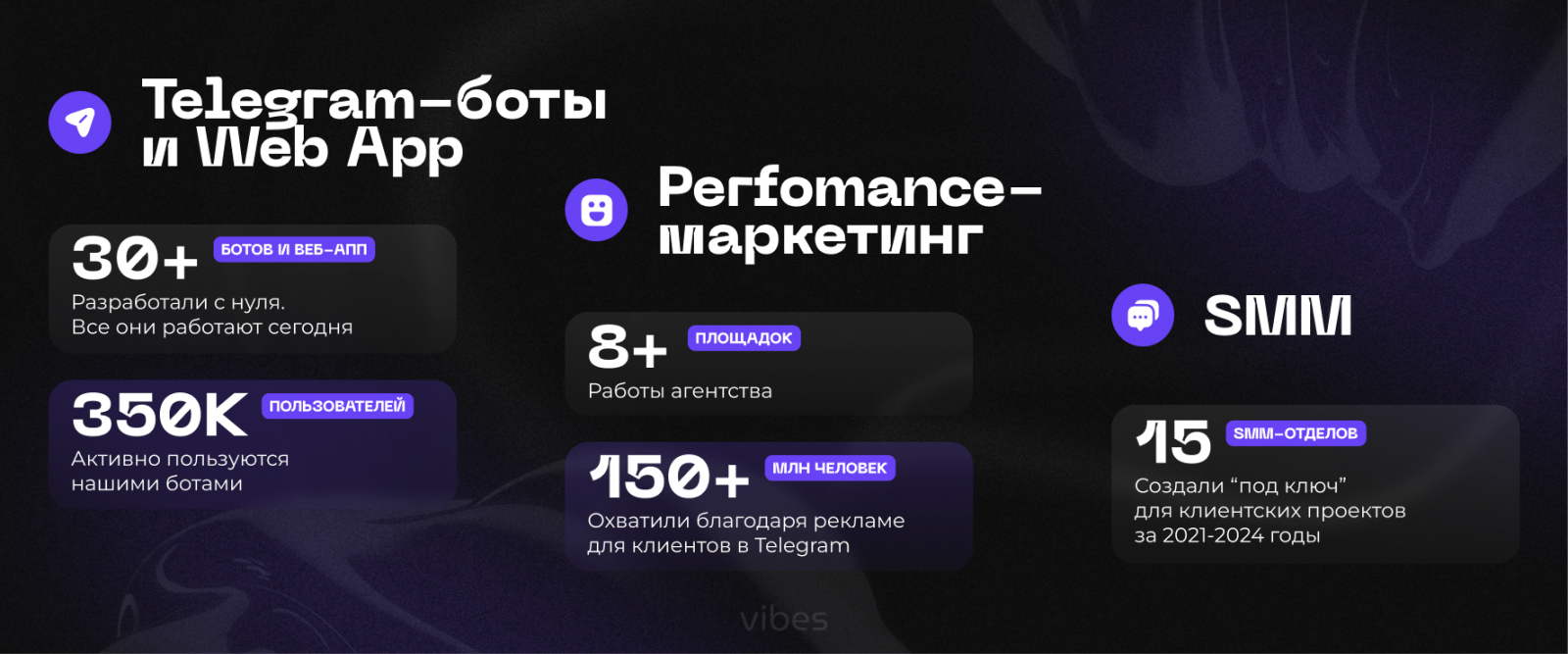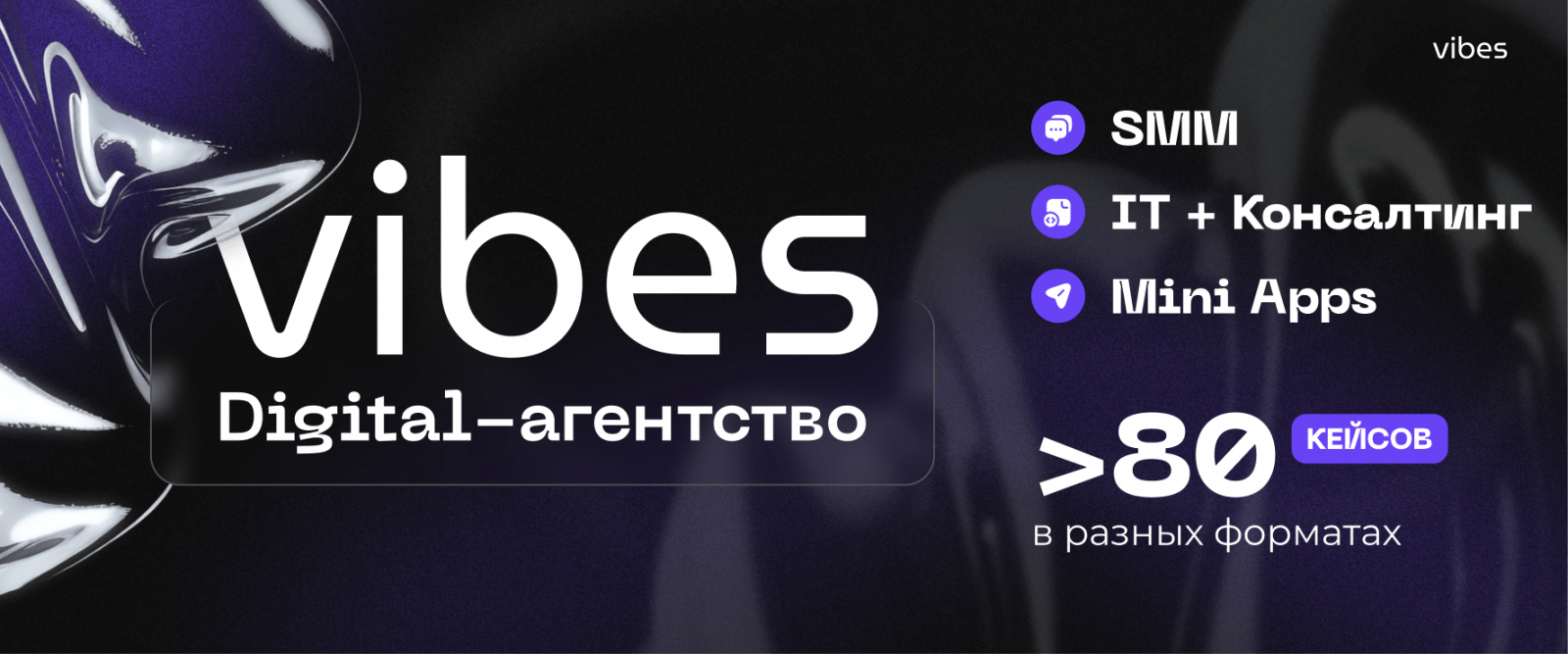 Сегодня экспертиза Vibes условно делится на 6 направлений – Mini Apps и Telegram-боты, SMM, IT + Консалтинг, Performance-маркетинг, Influence-маркетинг и Комплексная упаковка брендов, однако в реальности наши возможности не ограничены только ими.