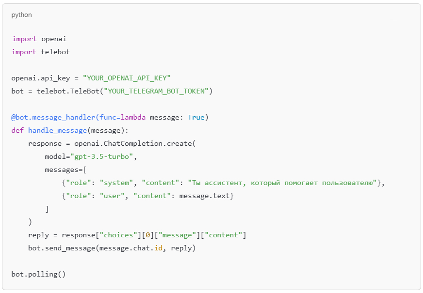 Допустим, вы хотите сделать бота, который пересылает пользовательский запрос в GPT-3.5 и отвечает в чате.