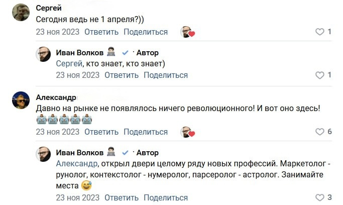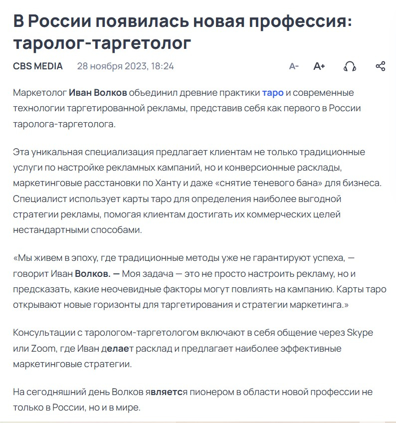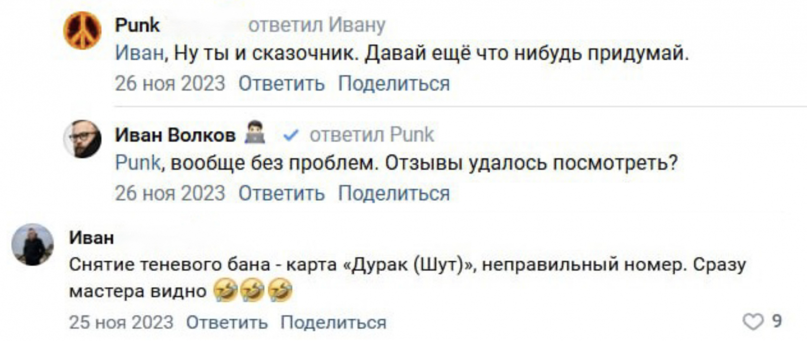 С другой стороны магическое комьюнити отмечает, что хоть Иван и слабый ведун, но маркетолог профессиональный: “Реальные отзывы на работу таролога-таргетолога отсутствуют, но как маркетолог Иван Волков получает положительные отклики”.