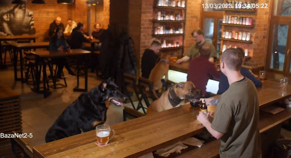 Идея: Вирусное видео с камеры наблюдения. Собаки сидят за барной стойкой. Съемка со скрытой камеры. Обычный день паба.
