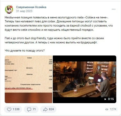 Во время первых тестов оценивали какой вариант видео будет более привлекательным для пользователей социальных сетей: ч/б или цветной. По кликабельности и тот и другой вариант получились примерно одинаково эффективными, в плане привлечения подписчиков и увеличения просмотров, но у цветного варианта была выше вовлеченность (лайки+репосты). Также добавили в пост фото меню с пивной позицией для собак.