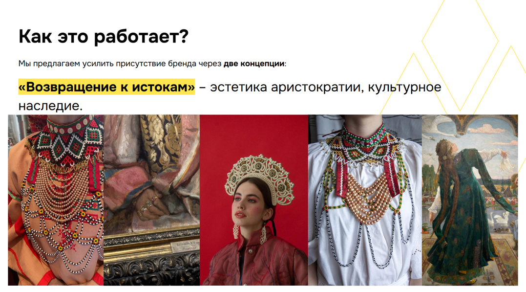 Сейчас у зумеров – тренд на время, в котором они не жили. Они ностальгируют по 90-м, хотя родились в 2005-м, восхищаются стилем дворянских дочерей из позапрошлого века, но сами выросли на мемах. Они не смогут купить эти украшения, но создадут виральный эффект, потому что таким необычным столкновением эпох точно захочется поделиться. А как раз за счёт этого мы соберем охват и громко заявим о себе.