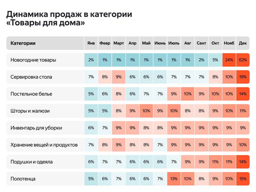 Праздничные периоды: новогодние товары на маркетплейсах с жесткой сезонностью (спрос превышает обычный уровень свыше 50%), школьные товары к 1 сентября, подарки к 8 марта и 14 февраля.