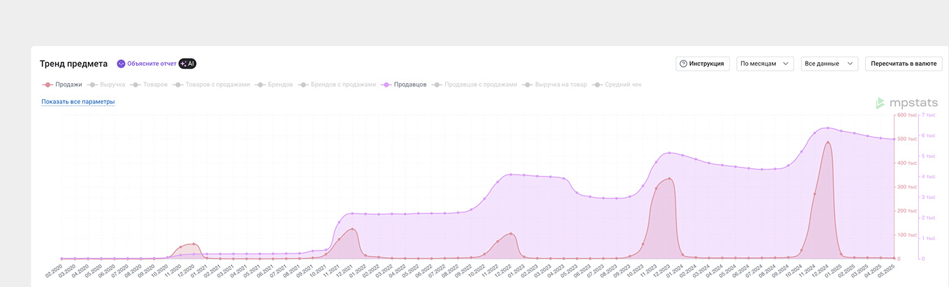 Используйте внутреннюю аналитику маркетплейсов — она покажет частоту поисковых запросов и динамику интереса. Сторонние сервисы дают более глубокую картину: MPSTATS показывает продажи и выручку по категориям, Moneyplace — оптимальные ценовые сегменты.