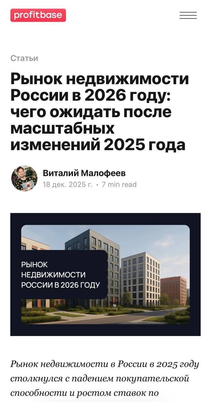 Статья Profitbase в ИИ-выдаче по запросу «рынок недвижимости 2026»