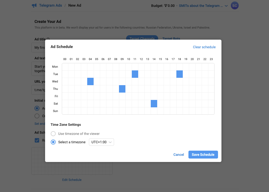 Не так давно в Telegram появился инструмент, позволяющий настраивать расписание кампаний. Он позволяет автоматически вести рекламу только в определённое время суток или в конкретные дни недели.